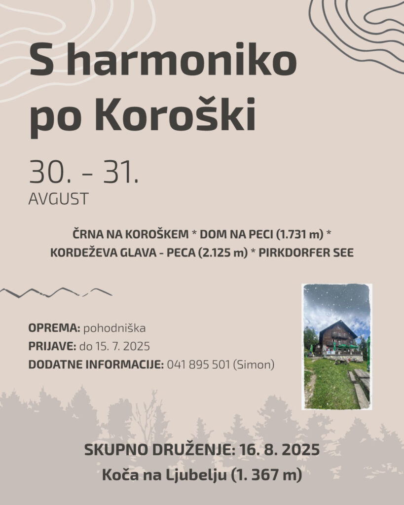 Glasbena šola Bučar se letos že 12. zaporedno leto odpravlja na dvodnevni pohod s harmonikami. Po tem, ko so z glasbo in odločnimi koraki že razveselili obalo, Postojnsko jamo, Belo Krajino, Prekmurje in Goričko, Sedmera jezera, Robanov in Matkov kot ter Logarsko dolino, Posočje, Goriška Brda, Pohorje in kar dvakrat že 2864 metrov visok Triglav, bodo zadnji avgustovski vikend njihove harmonike odmevale po Koroški.
